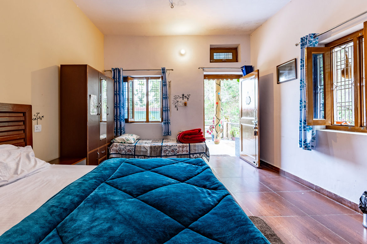 These rooms are very spacious with a king-size bed, and we provide an extra cot in each. They are perfect for a family of three or four: parents and their two kids. Each room has an attached washroom and a common area in front of it. We have three of this kind, which are among our best sellers among families seeking quality family time with their loved ones. Please note that these rooms do not come with a private kitchen; all food is served by our staff through room service.
